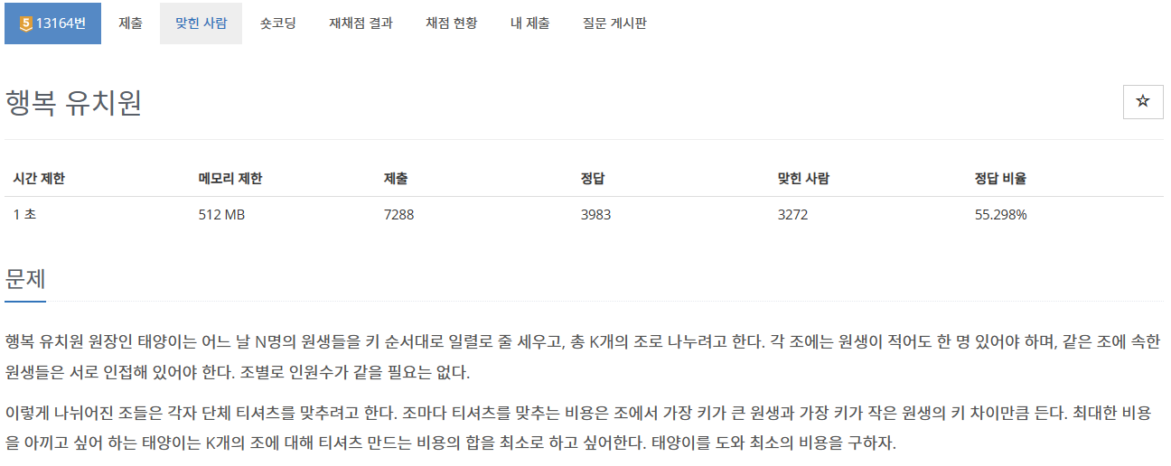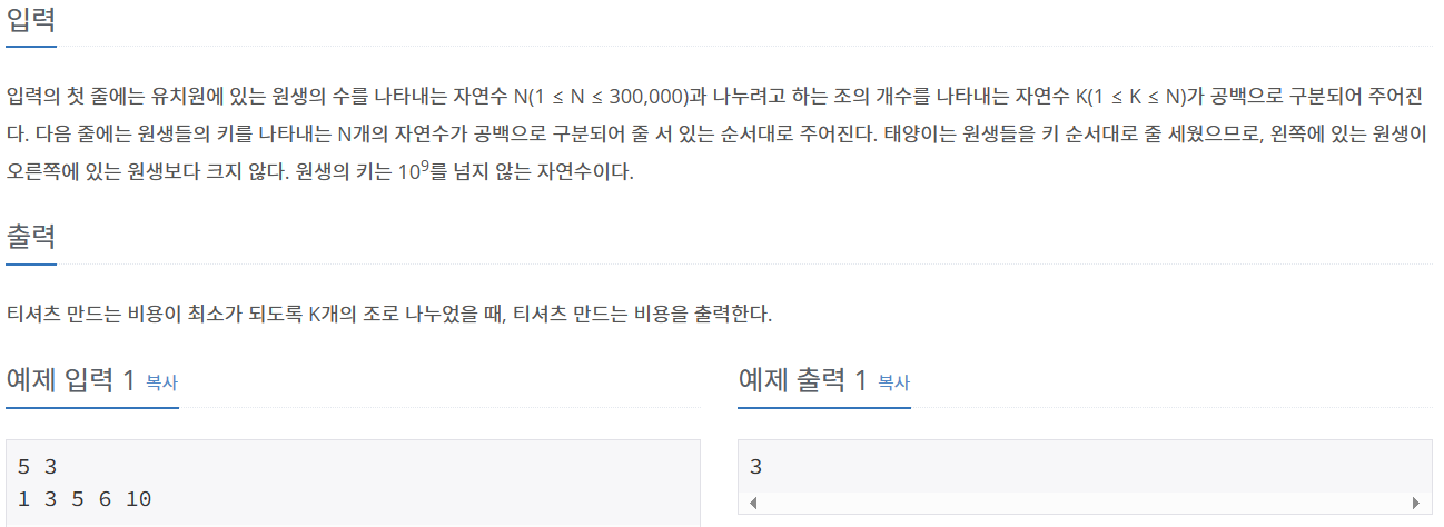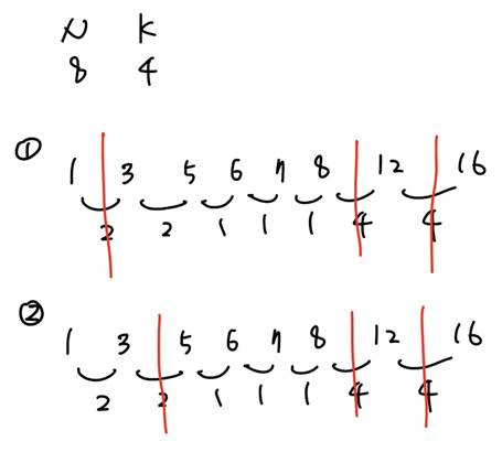 예시에서는 2, 4, 4 차이가 있는 부분에 구분을 두는 것이 가장 차이의 합이 작아진다.
