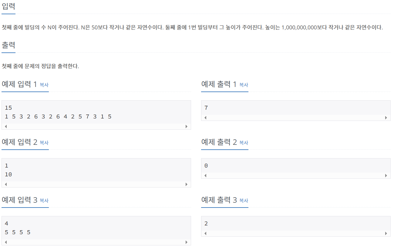 따라서, 가까운 빌딩들부터 순서대로 기울기를 구하고, 왼쪽의 경우 더 작은 기울기가 있으면 +1, 오른쪽의 경우 더 큰 기울기가 있으면 +1 해준다.