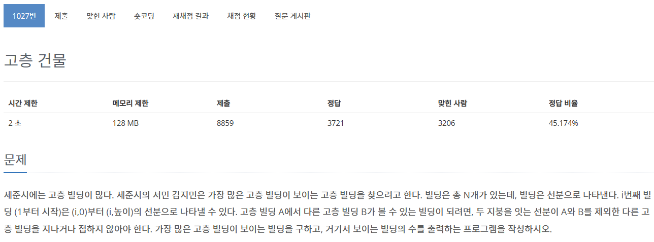 이 문제를 풀기 위해서는 i 번째 건물에서 (N-1)개의 건물들과 기울기를 구해서 비교해야 한다.
