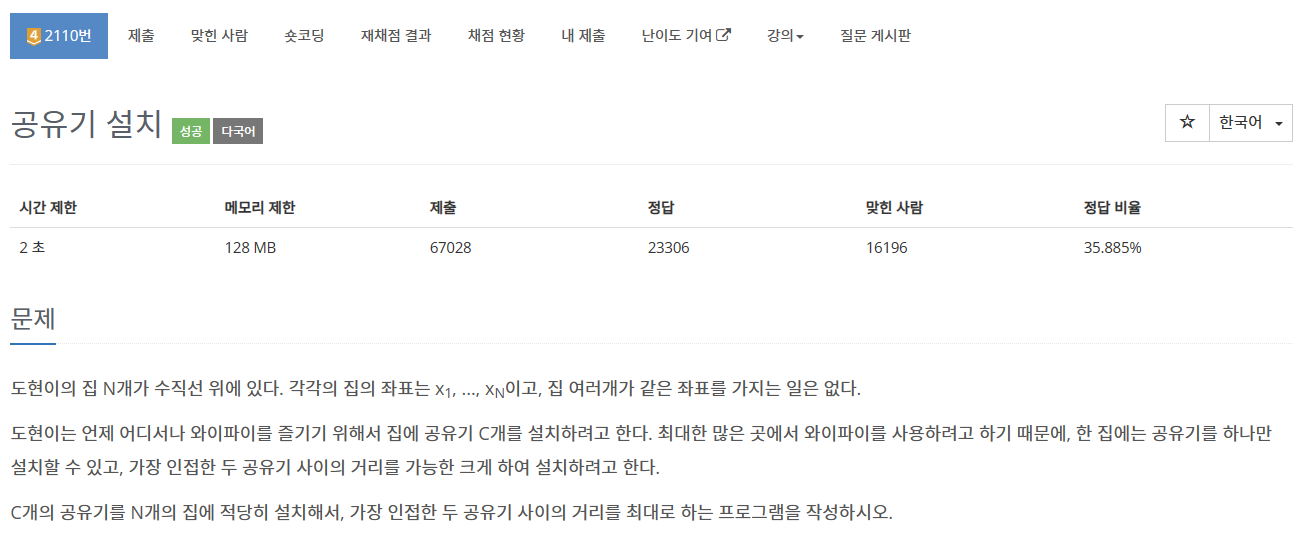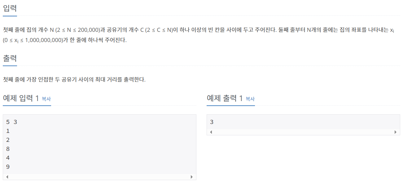 end = arr[-1] - arr[0] # 두 공유기 사이의 거리 최대값
