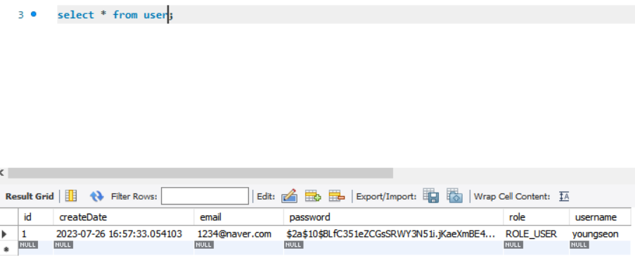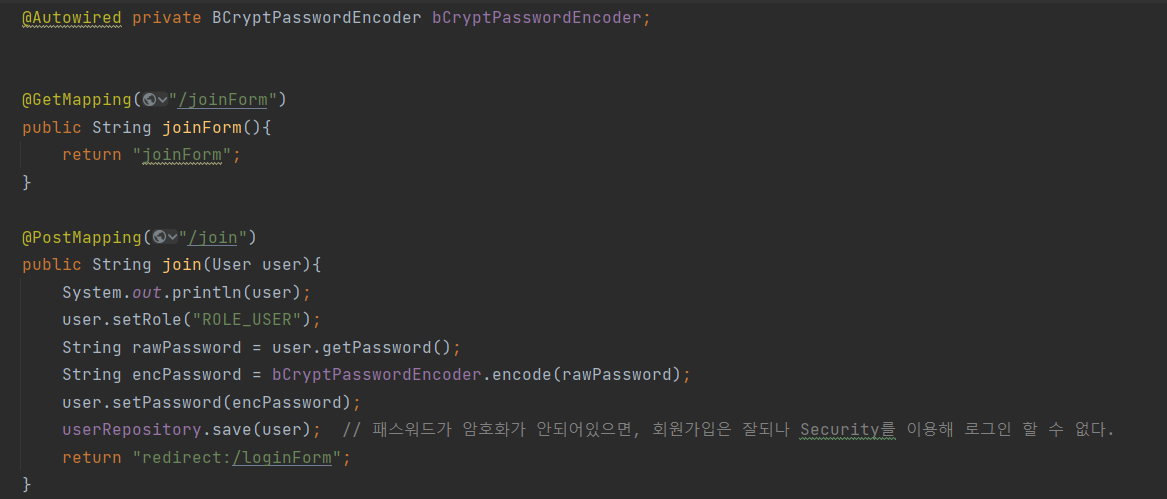 패스워드가 암호화 되어 있어야만 , Security 사용하여 로그인 할 수 있다.