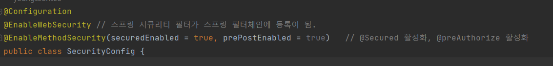 @EnableWebSecurity // 스프링 시큐리티 필터가 스프링 필터체인에 등록이 됨.