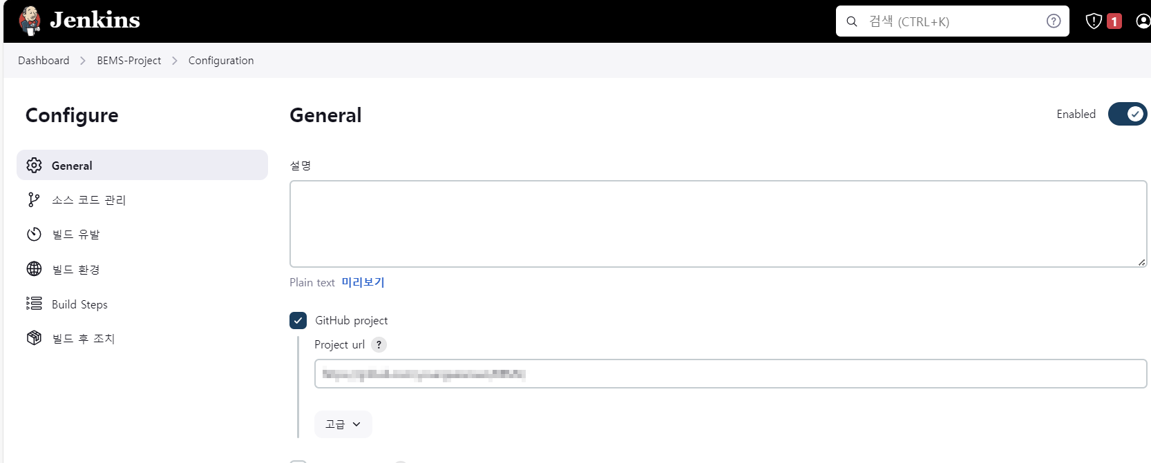 대시보드에 해당 프로젝트가 생성되면, 해당 프로젝트를 선택하고, 구성을 눌러 git, gradle, jdk에 관한 설정을 해준다.