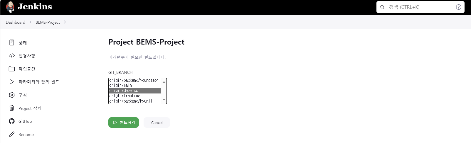 모든 설정을 마친 후, 파라미터와 함께 빌드를 선택하여 develop 브랜치로 빌드를 시도해보았다.