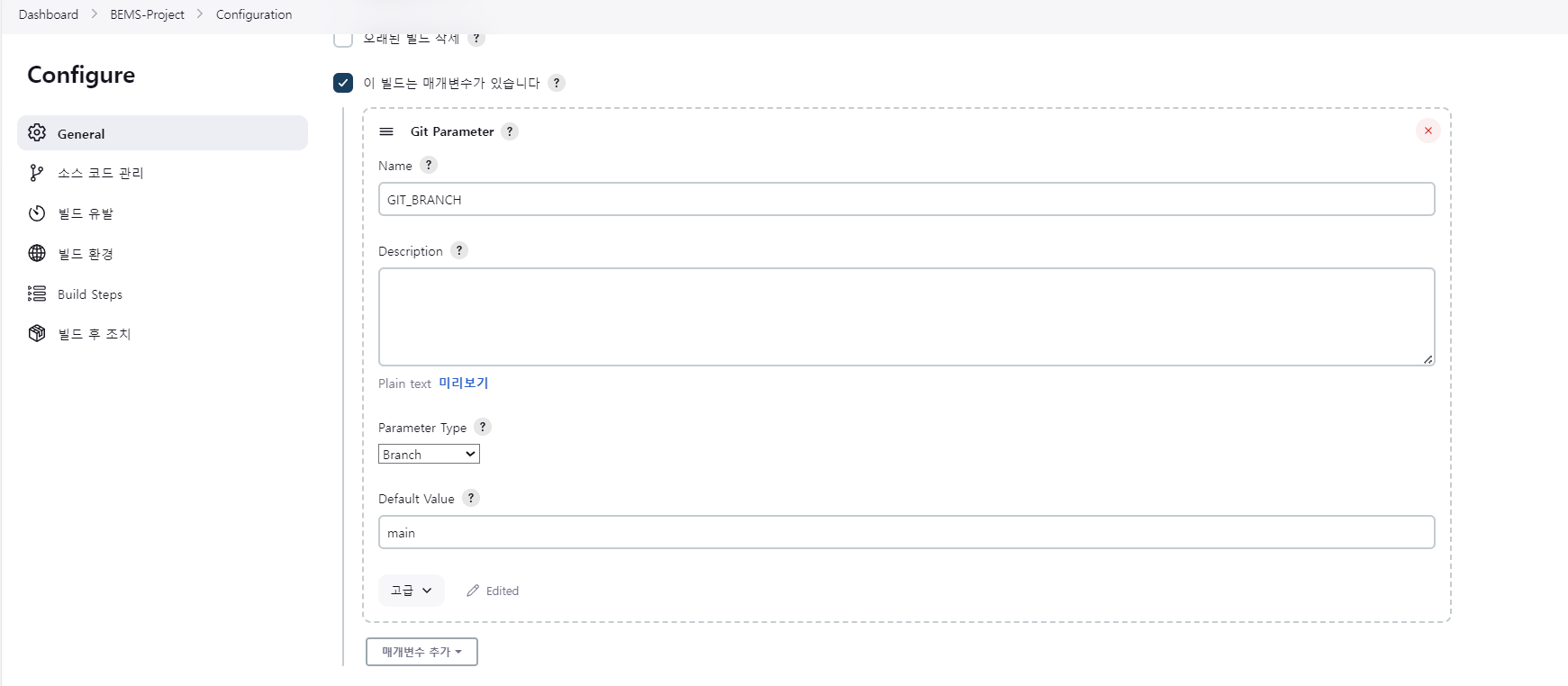 따라서, Jenkins Dashboard 에서 git parameter 플러그인을 다운받고, 다시 해당 프로젝트의 구성으로 돌아와