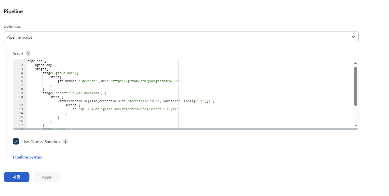 secretfile을 빌드해줄 새 아이템을 만들었다. Jenkins Pipeline Script를 이용해 아이템의 구성중 pipeline을 다음과 같이 설정해주었다.