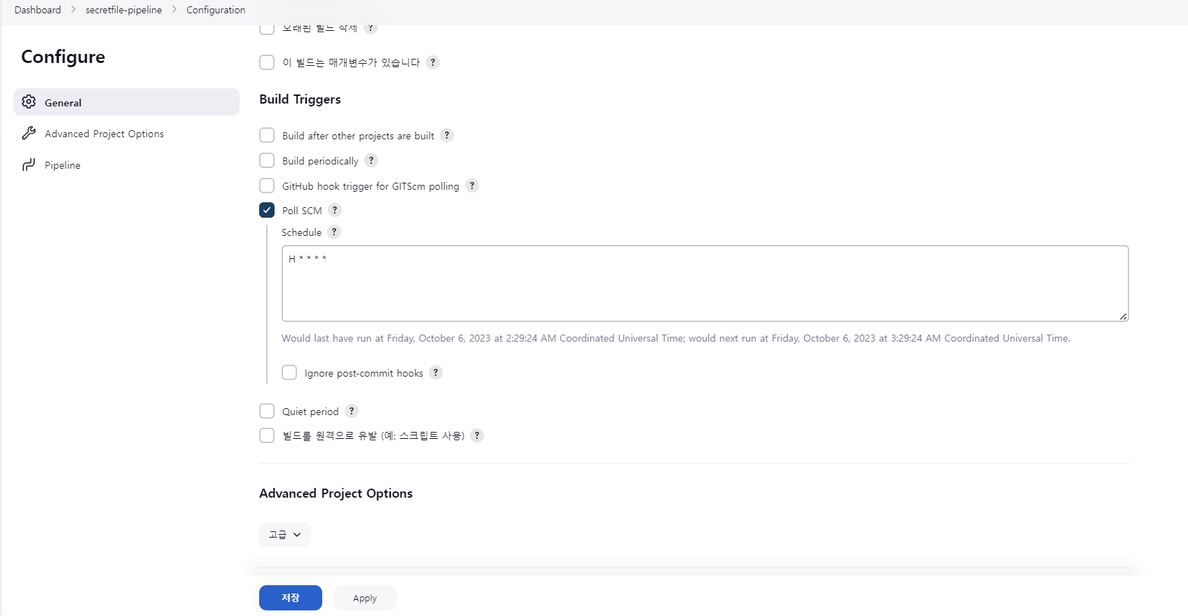 모니터링 서비스를 위해 한시간 마다 빌드되도록 PollSCM 을 설정했다.