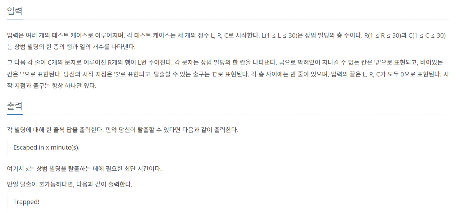 a 배열은 3차원 배열의 값을 입력받고, d 배열은 해당 위치까지의 최단 거리를 저장, q는 bfs의 거리를 구하는데 사용한다.