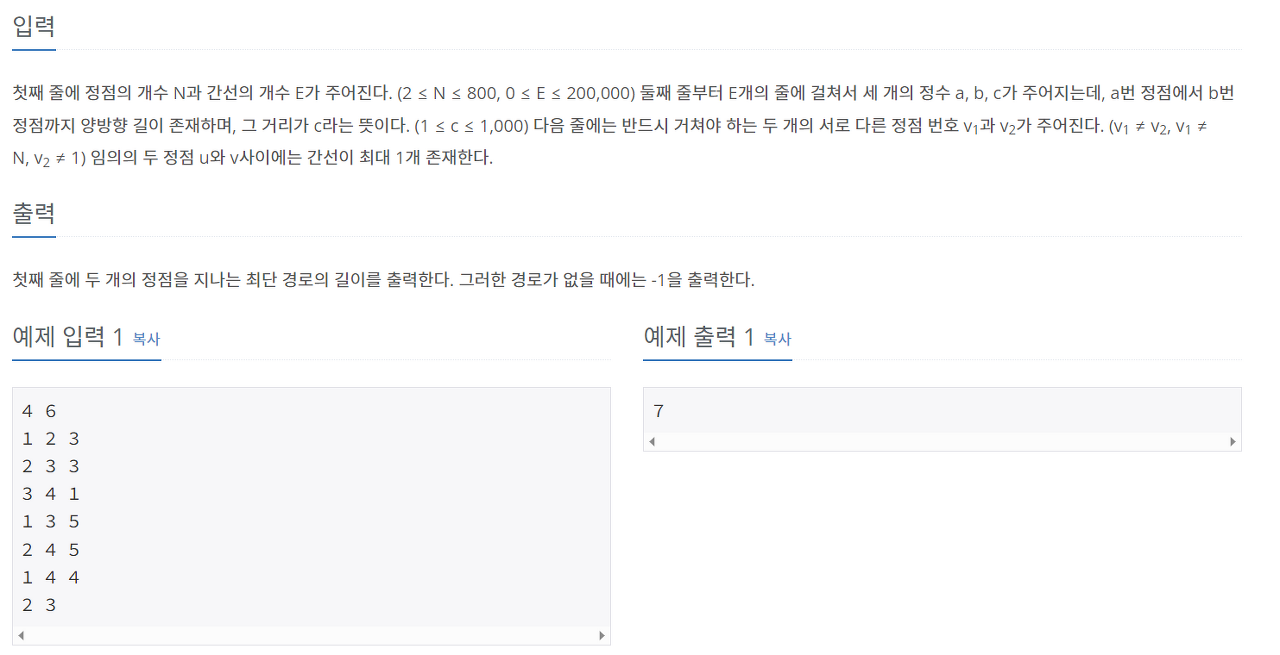 이 문제는 시작 노드에서 두개의 정점을 지나 마지막 노드까지 가는 경로의 최단 경로를 구하는 것으로,