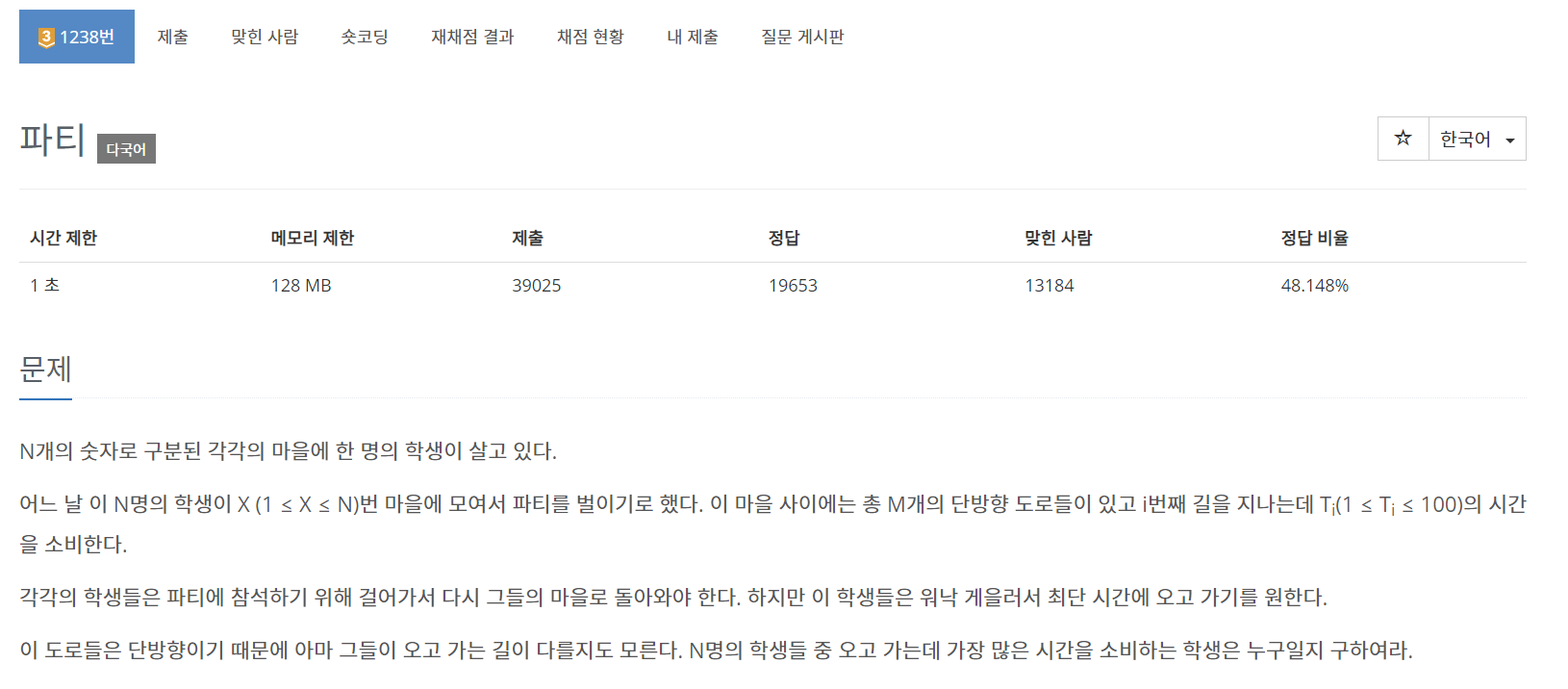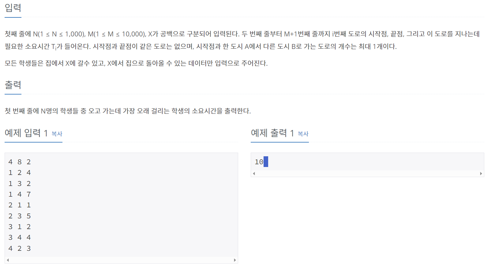 먼저 간단한 다익스트라 구조를 이용하여 가는 거리와 오는 거리를 구해 최댓값을 구했는데, 입출력은 동일하나 시간 초과가 나왔다.