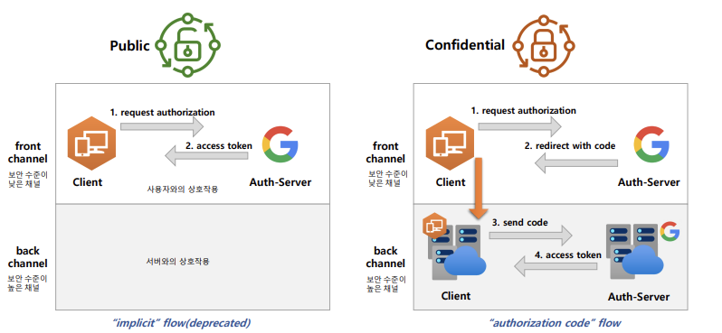 - 기밀 클라이언트 (Confidential Clients) - " authorization code" flow