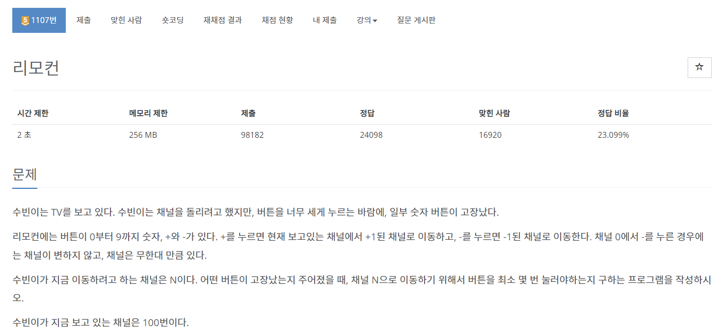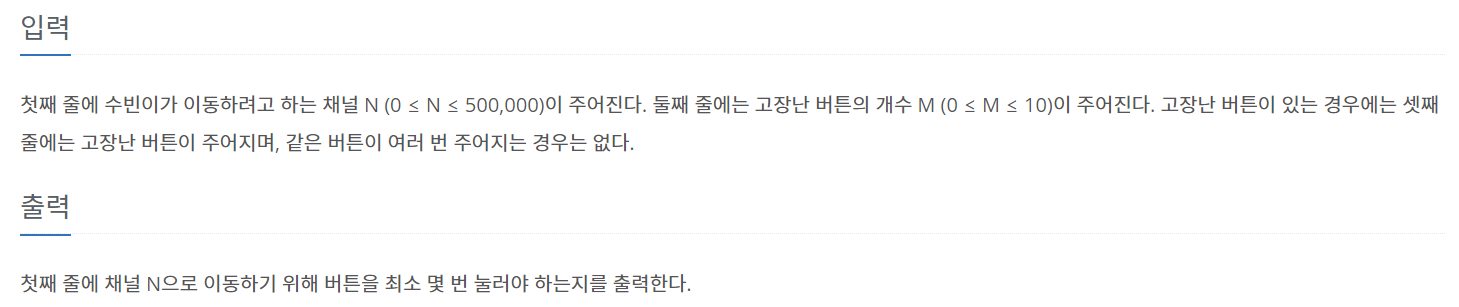 이떄, 채널 0에서 -를 누른 경우에는 채널이 변하지 않지만, 채널은 무한대 만큼 있다는 조건이 있으므로, 채널을 밑으로 내려오는 경우를 고려해 채널 수인 50000의 2배인 100000까지 비교해야 한다.